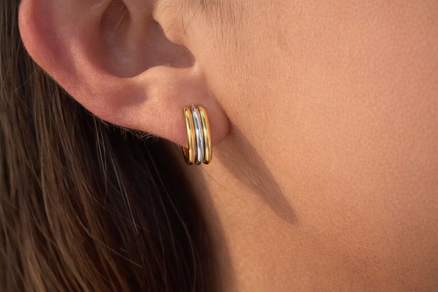 The Parker Earring 18K gold-plated hoops featuring a sleek, multi-band design with mixed metal tones for a modern, elevated look.
