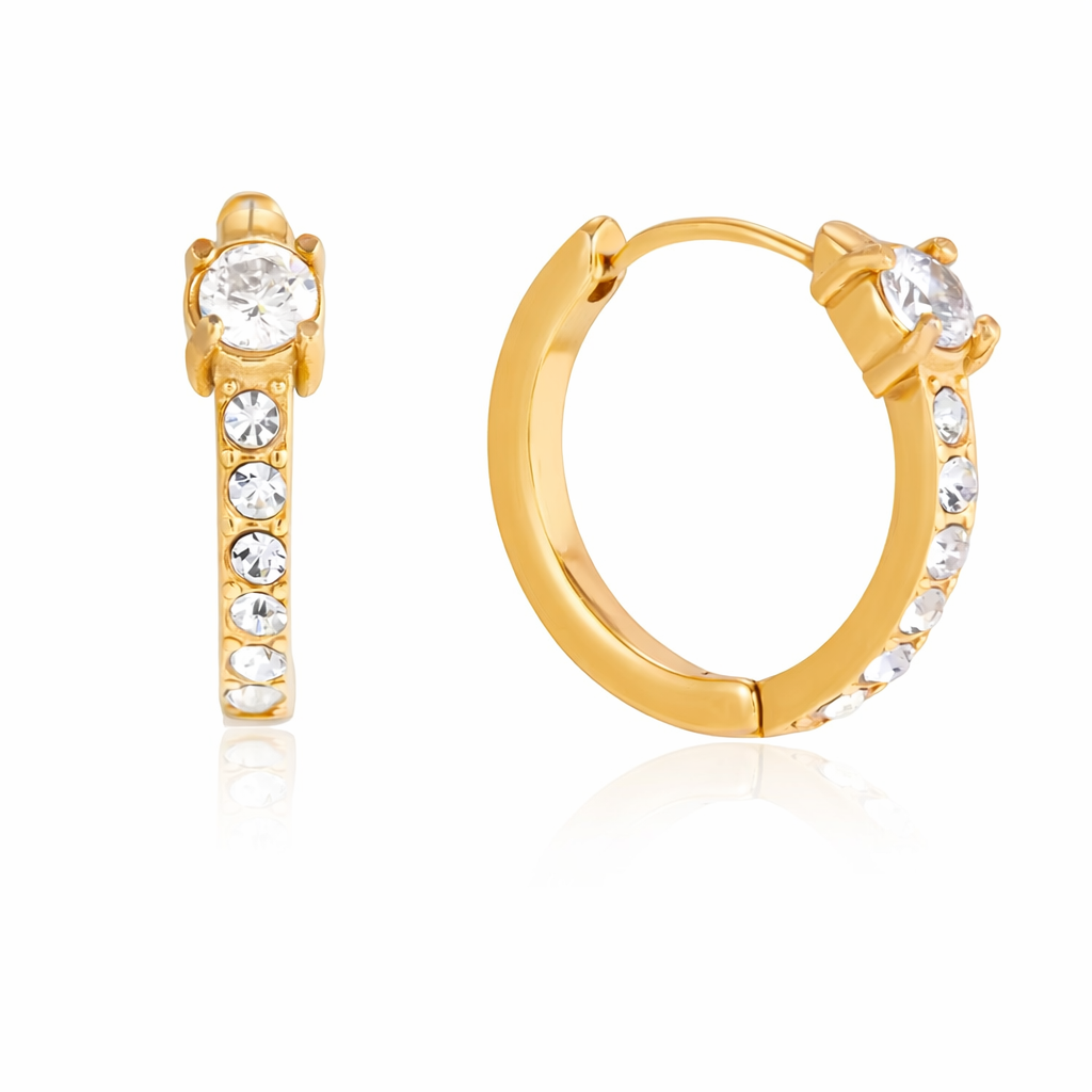 The Sutton Earring 18K gold-plated huggies accented with a prong-set cubic zirconia and a line of shimmering stones for a timeless, luminous finish.